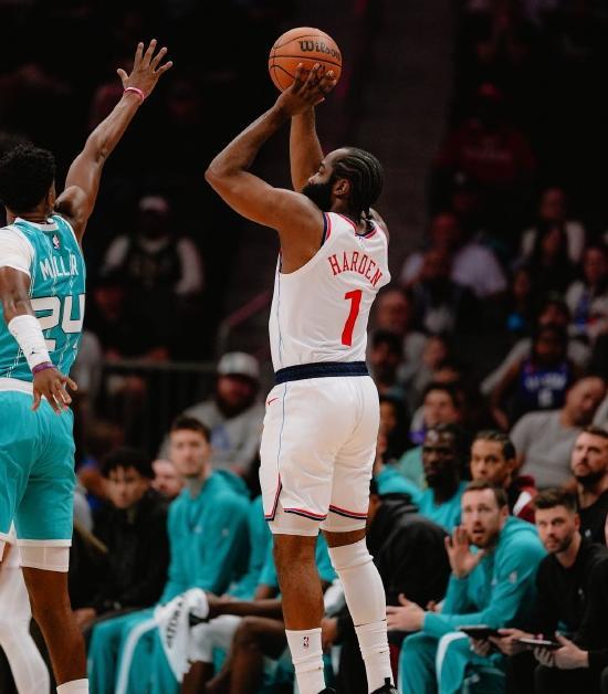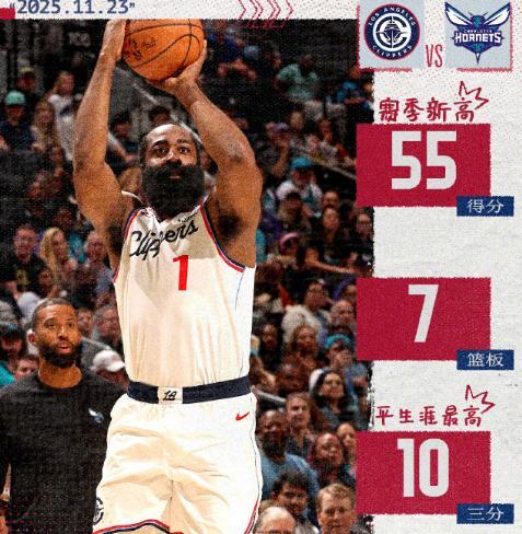 11月23日,NBA常规赛快船以131比116大胜黄蜂,本场比赛,哈登全场26投17中,贡献55分3篮板7助攻。
