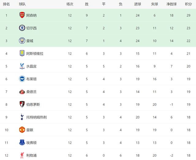 随着曼联0-1埃弗顿,英超第12轮结束了所有比赛,最新积分榜如下