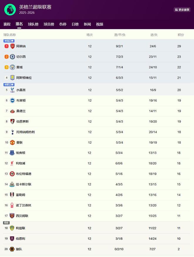 随着曼联0-1埃弗顿,英超第12轮结束了所有比赛,最新积分榜如下