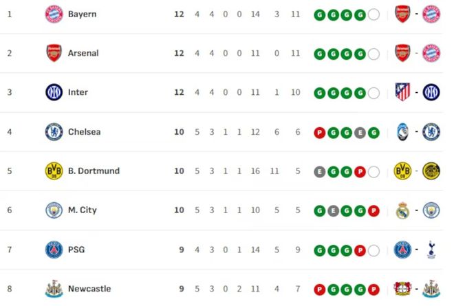 直接晋级16强球队(当前前8名): 拜仁慕尼黑、阿森纳、国际米兰、切尔西、多特蒙德、曼城、巴黎圣日耳曼、纽卡斯尔联