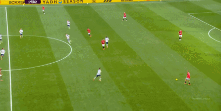 但考虑到身后的卢克-肖和多尔古都在技术上存在短板,这一侧其实更需要边锋的回撤拿球,但姆贝乌莫在这一环节显然没有库尼亚打在这个位置上那么自然,所以打不上去的时候依然不少: