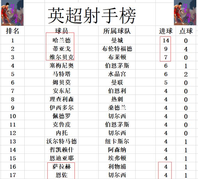 射手榜方面,哈兰德今天错失单刀良机没有进球,还是14球领跑。蒂亚戈打入一球,将和哈兰德的差距缩小到5球,维尔贝克破门,多塞梅尼奥,马特塔1球独居第3。内托,恩佐今天各入一球,追上萨拉赫,哲凯赖什等人4球刚好挤入前十。